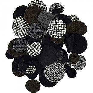 Pre-felted wool, cut into circles. 24 of each size included: 1" wide, 1.5" wide, 2" wide. Colors will vary, but will each be a variety of black, solid or print.