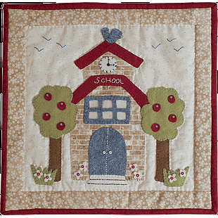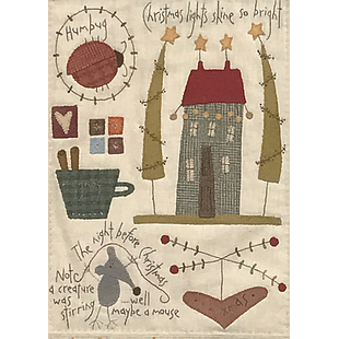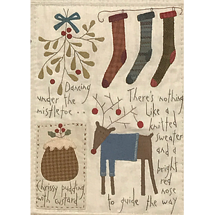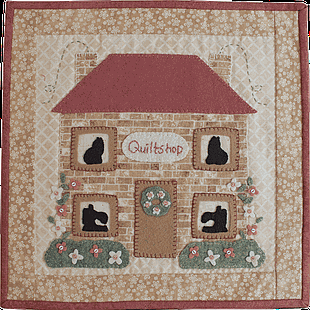 Designed by Rinske Stevens. Block of the Month project the Cosy Cottage. Complete kit including the fabrics for the top and binding, buttons, vilt, embroidery floss and pattern. Please add backing and batting.