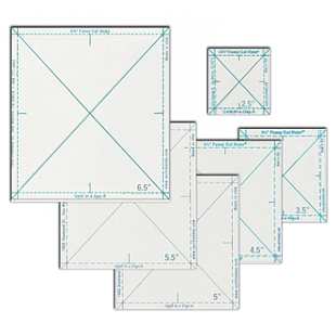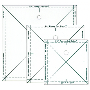 A fussy cut is a selected image, such as a flower, centered on your patch. With a Fussy Cut Ruler, you can cut the identical image from your fabric repeatedly with ease. The Complete Fussy Cut Ruler Set is a set of six laser precise heavy gauge plastic rulers in these sizes: 2-1/2, 3-1/2, 4-1/2, 5, 5-1/2 and 6-1/2. Quarter inch lines are provided for seam allowances. Perfect places for Fussy Cuts are the center or four corners of your block, or the cornerstones of lattice. Fully illustrated and detailed instructions are included.