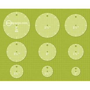 Contains nine templates. Sizes include: 1", 1-1/4", 1-1/2", 1-3/4", 2", 2-1/4", 2-1/2", 2-3/4" and 3". Each template contains evenly spaced markings for quick and easy planing of perfectly spaced stitches each and every time! Uses: mark directly on Wool, Cotton, Linen and other materials, create freezer paper and plastic templates, drawing, sketching, embroidery, Sashiko. Proudly Made in the USA. Conveniently sized and great for stitching on the go! Designed in Sue Spargo’s studio, these high quality, large bodied templates are ideal for directly tracing shapes onto Wool, Cotton, Linen or other materials. Each template contains markings to plan, mark and evenly space your stitches around each shape. Did you know??? When tracing directly on wool, you are guaranteed to get a perfect,sharp, shape if you trace around the outside of a {single solid} template, rather than the inside {such as templates with shapes "cut out" of them}.